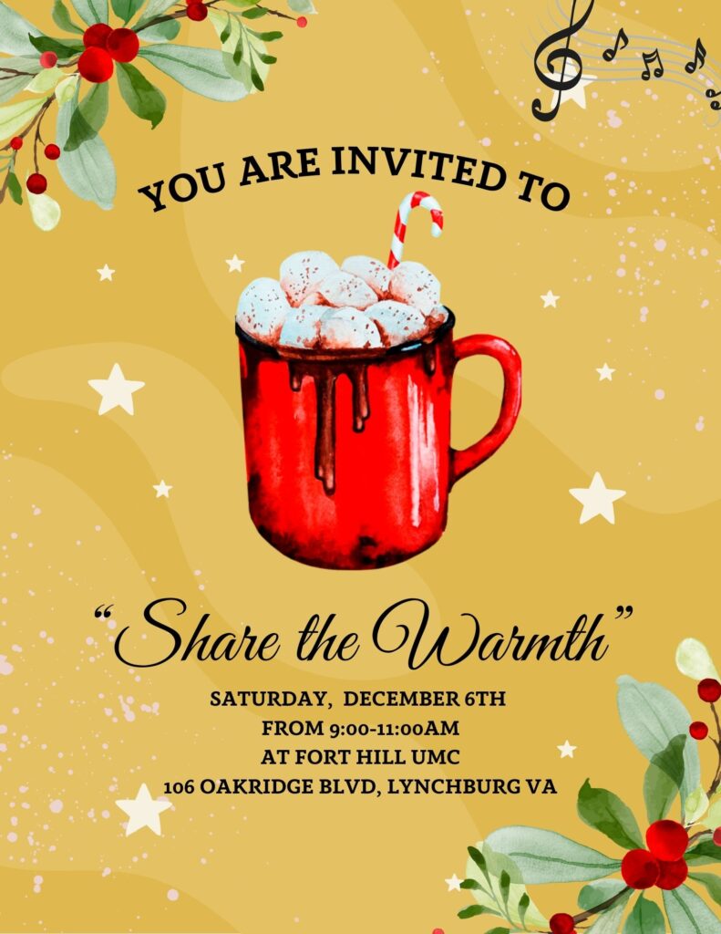 Join us for coffee, cocoa, candy canes, and carols on Saturday, December 6 from 9:00-11:00 a.m. as we spread God’s love and warmth with our neighbors!