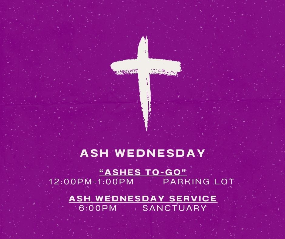 This year we will making the traditional Lenten observance of the imposition of ashes more accessible and visible to our community. The Worship Team will provide the imposition of ashes and a prayer in the church parking lot between 12:00pm and 1:00. In case of inclement weather, we will move to the porch/Narthex area in front of the church.
